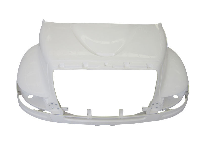 DuraBuilt's high quality fiberglass International 4400 replacement hood is designed to accept factory style lights and mounting hardware. The hood center line measures 41 inches and includes the taller headlight filler panels. The hood does not come with the hinge cross bar and will not replace the old air intake style hoods (See hood number INH-934).