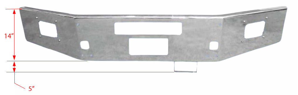 Big Truck Hoods offers this T800,T880 Chrome 14" bumper for your truck. Our Durabuilt bumpers offer great looks for an affordable price. This bumper features a break-back design with tapered (open) ends, tow, vent holes, fog light cutouts, and step.